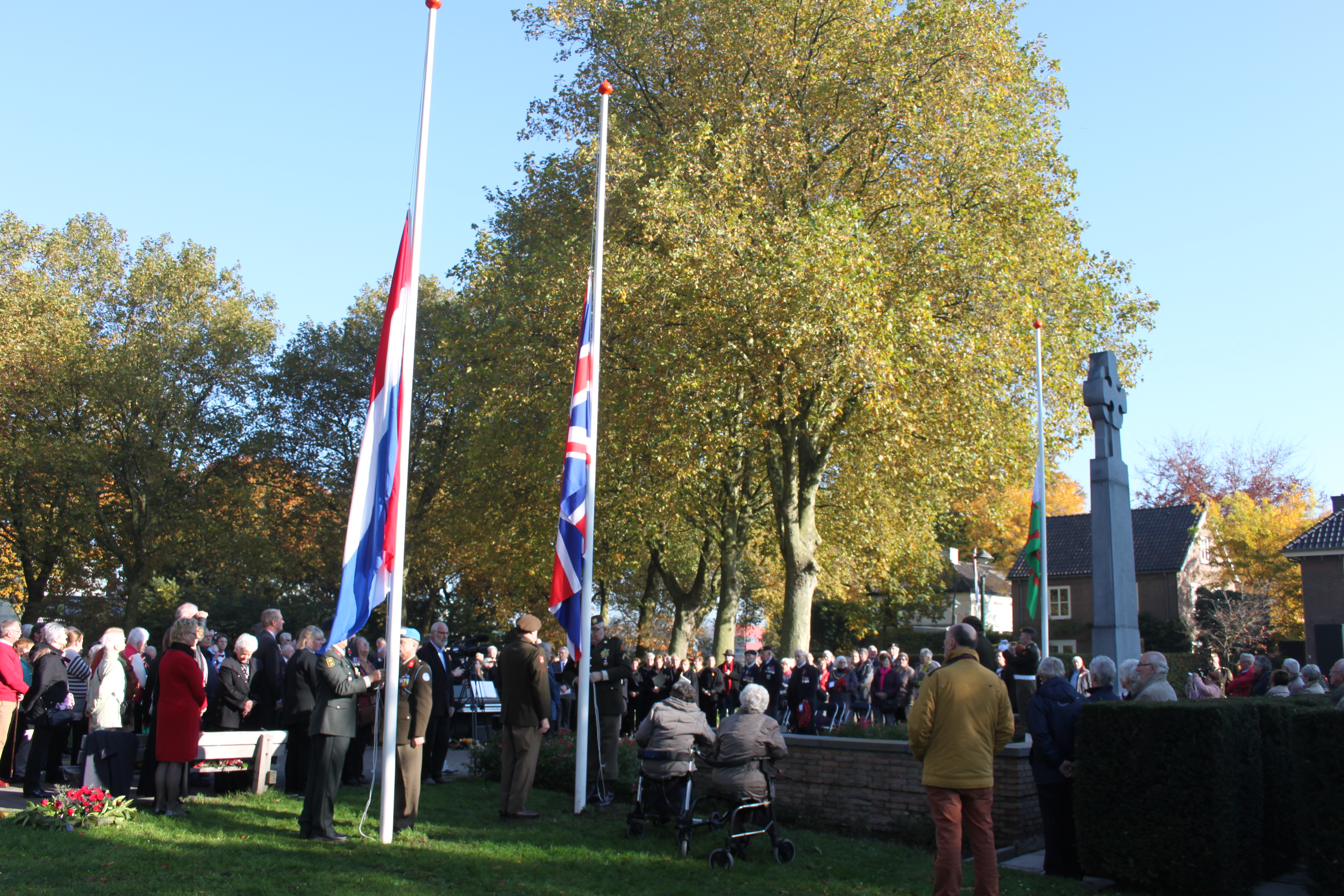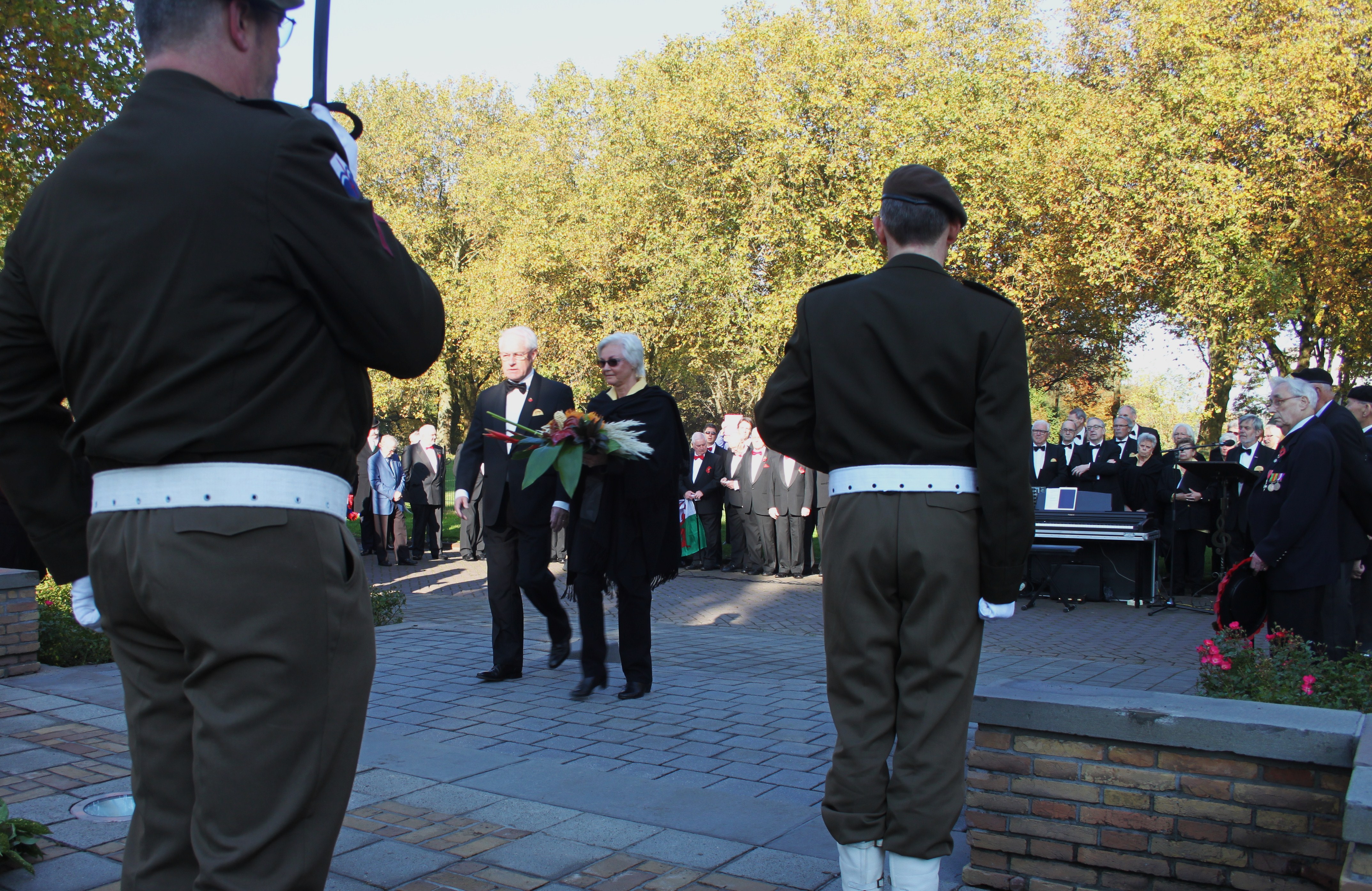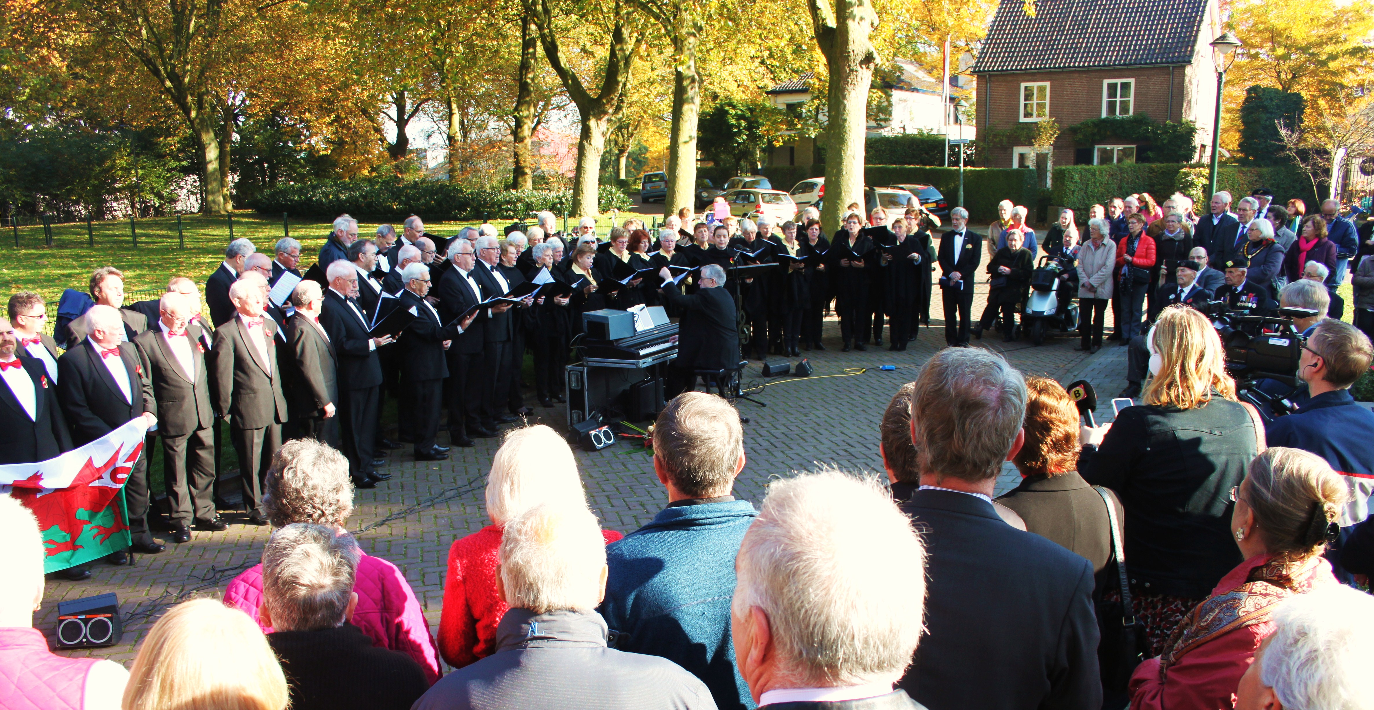 Het was voor de tijd van het jaar een stralende ochtend op het 53rd Welsh Divisionplein afgelopen dinsdag 27 oktober 2015. Vanuit een strakblauwe lucht verwarmde de herfstzon de ruim 200 aanwezigen, die zich rond het Royal Welsh Memorial hadden verzameld. Sinds de oprichting van het monument in 1952 is er jaarlijks een herdenking geweest voor de 146 gesneuvelden van de 53rd Welsh Division, de groep soldaten die ‘s-Hertogenbosch op 27 oktober 1944 bevrijdde. De “Stichting October 1944” verzorgde samen met de gemeente steeds de herdenking. Vorig jaar was dat voor de 70ste keer en voor het laatst. Dit jaar herdacht de gemeente ’s-Hertogenbosch de Tweede Wereldoorlog centraal in de Casinotuin tijdens de Nationale Dodenherdenking op 4 mei. De voortzetting van de herdenking op de historische grond van het Divisionplein, de plek waar de Welsh soldaten zich verzameld hadden op 24 oktober 1944 om ‘s-Hertogenbosch stormenderhand in te nemen, werd overgelaten aan lokale initiatieven. Het bestuur van het Gemengd Koor ’s-Hertogenbosch besloot daarop de herdenking te “adopteren” en de organisatie op zich te nemen. Deelnemers die ook betrokkenen waren bij de vorige herdenkingen werden hierop uitgenodigd om ook een onderdeel van deze bijeenkomst te verzorgen. En zo stonden op die stralende dinsdag 27 oktober zoals vanouds, op een indrukwekkende wijze weer vele deelnemers en toeschouwers in een eerbiedige kring rondom het monument. Het werd doodstil toen Nederlandse veteranen, ooit betrokken bij buitenlandse missies, hun posities innamen bij de vlaggenstokken en andere oud-strijders, bijgestaan door een hoornblazer, de erewacht vormden op de treden van het monument.